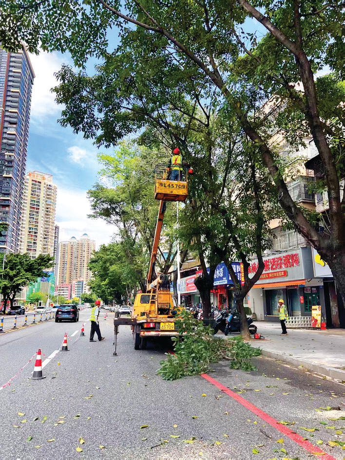 市城管執法局開展園林綠化防災工作,對行道樹等綠化樹木進行修剪和加固處理。 惠州日報記者譚琳 攝