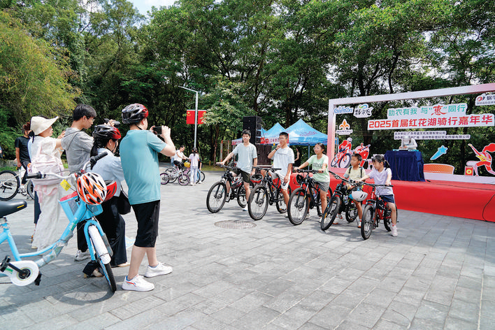 10月2日上午,紅花湖景區人頭攢動,18公里的環湖綠道上,騎行休閑的市民游客處處可見。記者現場看到,市民游客只需在紅花湖綠道入口處報名參加騎行嘉年華活動,即可領取內有食品、飲料、紙巾、助農打卡單等物品的騎行能量包,并由主辦方提供自行車,開啟一段輕松愉悅的18公里騎行旅程。這是一場不限時的騎行,市民游客只需當日內歸還自行車、完成打卡,即可獲得有主辦方頒發的“騎士榮譽證書”。
