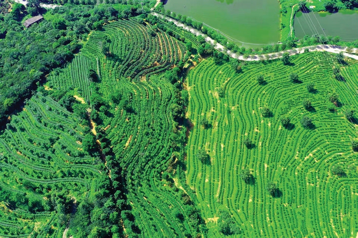 惠東生態(tài)茶園,從空中俯瞰,如妙手精心織就的綠色錦緞。層層疊疊的茶樹順著山勢(shì)蜿蜒起伏,線條流暢且富有韻律,似綠色的波浪在山間涌動(dòng)。