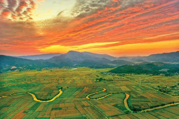 秋日傍晚,惠東縣稔山鎮(zhèn)竹園村稻田一片美麗景象。航拍視角下,黃綠稻浪如調(diào)色盤鋪展,蜿蜒河流在晚霞下泛著金波,與遠(yuǎn)山、絢爛云霞構(gòu)成夢幻畫卷。