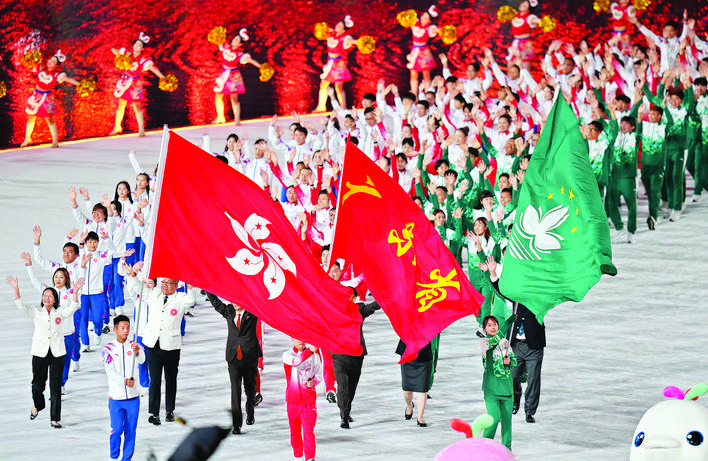 廣東省體育代表團、香港特別行政區(qū)體育代表團和澳門特別行政區(qū)體育代表團在入場儀式上共同入場。