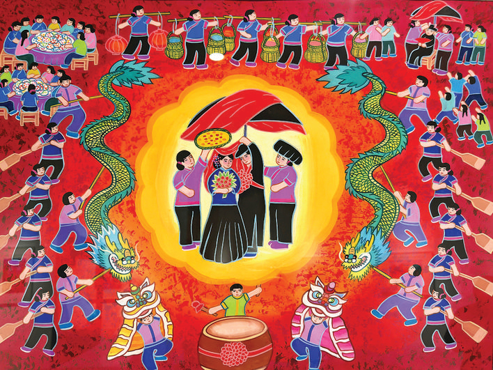 龍門農民畫《漁家婚嫁》(翻拍)。