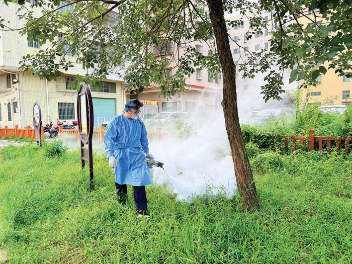 消殺人員用環保殺蟲劑噴灑草地。惠州日報記者黃尉宏 攝