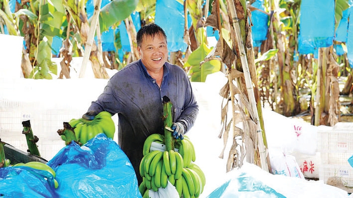 采收現(xiàn)場,工人們分工協(xié)作,精準挑選成熟蕉串,利落地砍下果軸,再用竹扁擔挑起百斤重擔,將果實完好運至田頭運輸點。采收后的香蕉被迅速分割成一梭一梭,經(jīng)清洗、分揀、包裝等初步處理后作為優(yōu)質(zhì)農(nóng)產(chǎn)品投放市場。