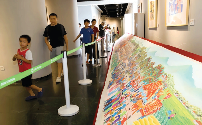展廳內,一幅長13米、寬1米的農民畫《非遺里的龍門》吸引市民紛紛駐足拍照,感嘆其創作之精妙、內容之豐富。這幅由龍門縣文化廣電旅游體育局策劃出品,黃偉平、廖錦鋒、梁彩歡、駱雪芳、羅秀芳、劉少夏、蘇曉明7位畫家歷時半年創作的作品在本次展覽中首度公開展出。舞火狗、做棚、上燈、虎頭花燈、醒獅、春牛舞、舞龍、織帶仔、造紙、盒籮、釀酒、米餅、胡須雞、大籠糍、西溪筍等40多項非遺瑰寶躍然紙上,人物神態栩栩如生,四時風俗熱鬧喜慶,山川景致清新宜人,堪稱龍門農民畫版的“清明上河圖”。