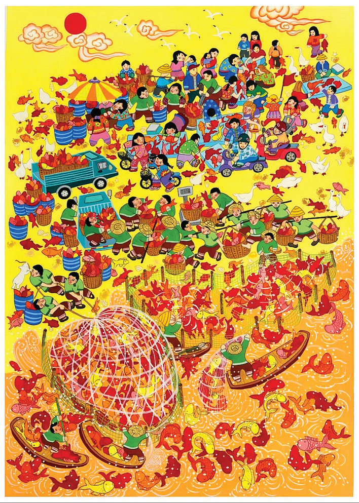 作為“中國現代民間繪畫畫鄉”“中國民間文化藝術之鄉”,龍門農民畫多年來堅持以濃墨重彩記錄生活本真,用質樸筆觸傳遞鄉土情懷。此次入選的4幅作品,延續了當地農民畫色彩明艷、構圖飽滿的藝術特色,既聚焦嶺南農事節慶、漁鄉市集等傳統題材,又融入新時代鄉村振興的鮮活氣息,把勞動的喜悅、豐收的盛景和群眾對美好生活的向往,實實在在地畫在了紙上,成為嶺南民俗文化的生動寫照。